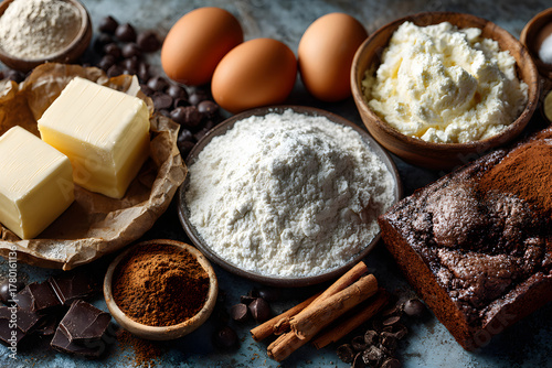 Ingredients for autumn winter festive baking - flour, brown sugar, eggs, chocolate drops, butter, cinnamon on stone or concrete background.Top view copy space.