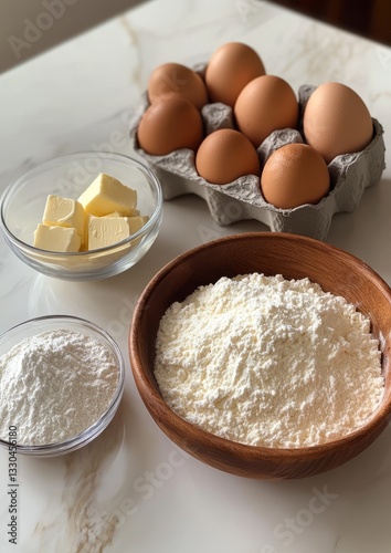 Ingredients for baking: butter in a small bowl, salt in a bowl, flour in a large wooden bowl, eggs in a carton.
