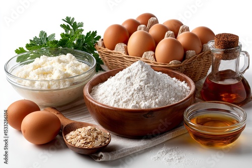 Ingredients for dough such as eggs, flour and butter isolated on white background