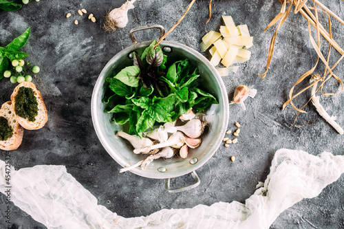 Ingredients for pesto sauce on a gray background. Basil, garlic, parmesan, pine nuts