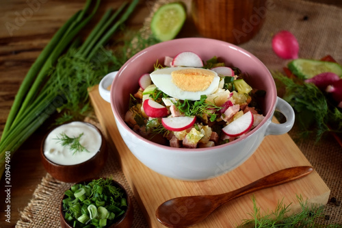 Ingredients for preparing the cold soup okroshka. Russian cuisine traditional meal