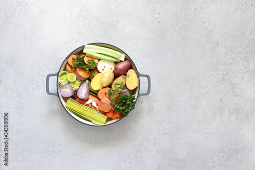 Ingredients for vegetable broth, vegetables, herbs, spices.