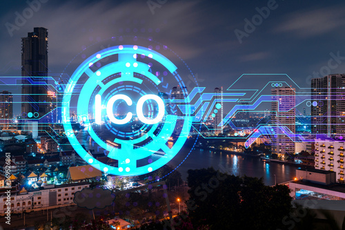 Initial coin offering hologram, night panorama city view of Bangkok, the center of cryptocurrency projects in Asia. The concept of widespread ICO hysteria. Double exposure.