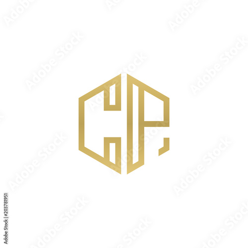Initial letter CP, minimalist line art hexagon shape logo, gold color