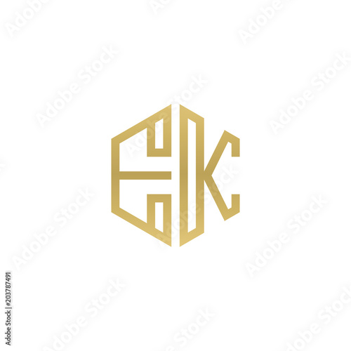 Initial letter EK, minimalist line art hexagon shape logo, gold color