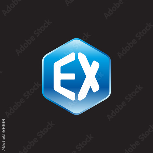 Initial letter EX, modern glossy hexagon logo, gradient blue color on black background