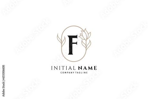 Initial letter f with oval frame decorated with flowers is suitable for fashion, beauty and jewelry industry font text, wedding invitations
