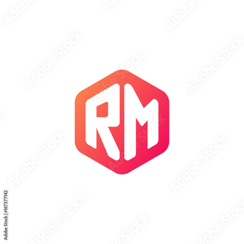 Initial letter rm, rounded hexagon logo, gradient red orange colors
