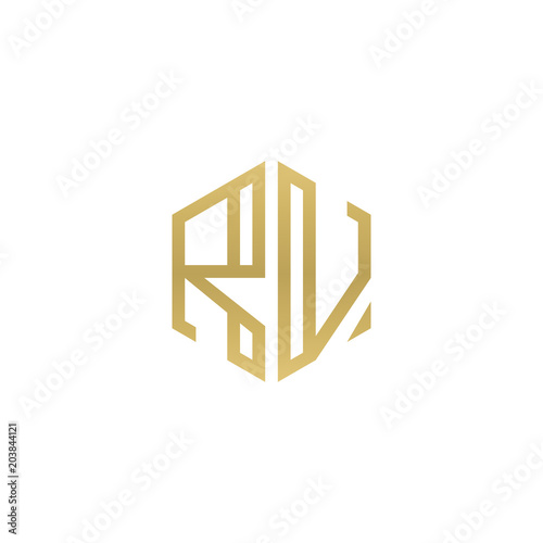 Initial letter RV, minimalist line art hexagon shape logo, gold color