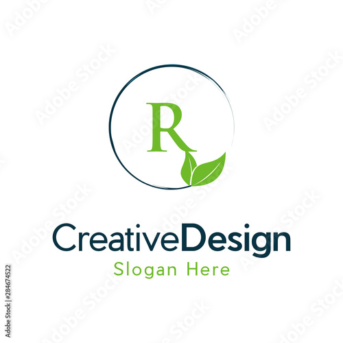 Initial R Green Letter and Leaf for Modern Beauty Nature Cosmetic, Vegan, Environmental, Creative Letter R Leaf Logo Design, Letter R Botanical Logo, Leaf Attached with Alphabet R