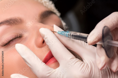 Injection rhinoplasty. Woman getting cosmetic injection of botulinum to nose
