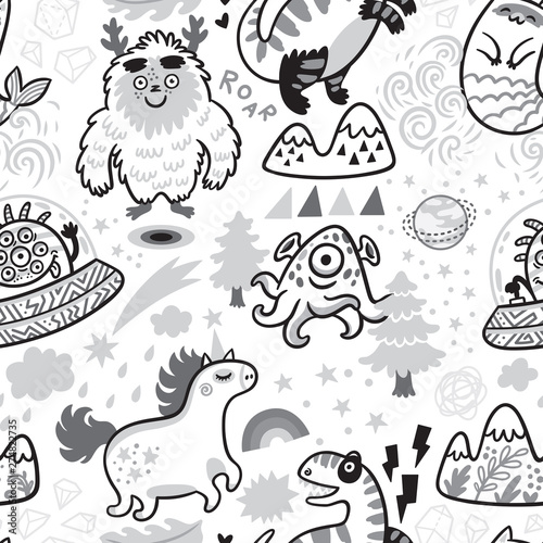 Ink seamless pattern with magical animals in cartoon comics style. Vector illustration