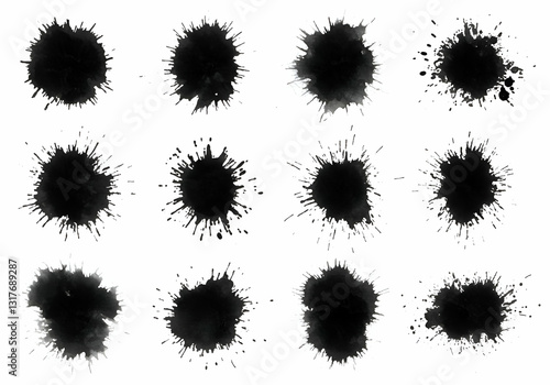 Ink Splatter Collection Black Paint Blot Grunge Texture Isolated on White