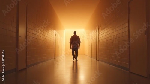 Inmate walking in a solitary prison corridor, showcasing isolation and confinement within a correctional facility
