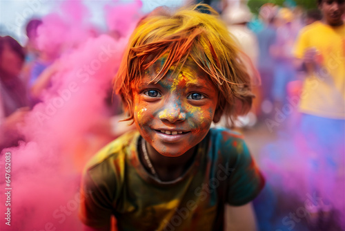 Innocent Gaze Amidst Hues: Close-up of a indian Child Celebrating Happy Holi with Color Clouds