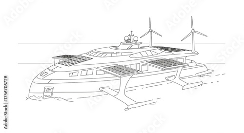 Innovative eco-friendly catamaran yacht powered by solar panels and wind turbines sailing across the ocean, showcasing sustainable maritime technology and future travel