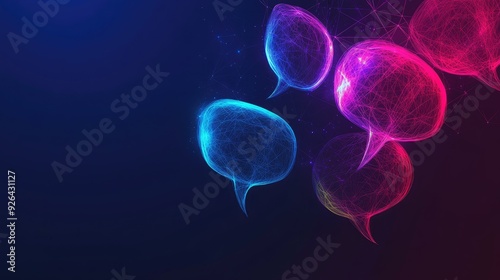Innovative e-commerce and communication banner featuring glowing speech bubbles in a polygonal style. Dark blue background with space for virtual networking and dialogue content.