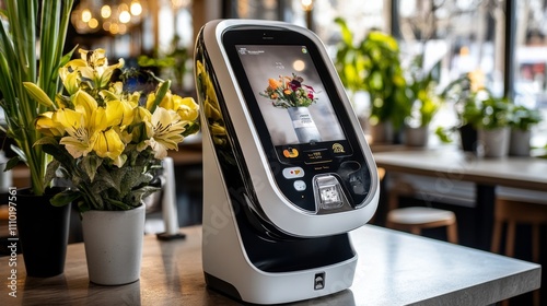 Innovative kitchen gadget displayed on a table surrounded by vibrant flowers in a modern restaurant setting