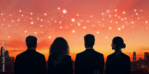 Innovative professionals observing sunset cityscape, connected by technology. Their silhouettes represent collaboration and future possibilities in urban environments
