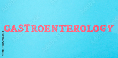 Inscription in red letters gastroenterology on a blue background. Concept section in medicine dealing with the treatment of diseases of the digestive system. digestive tract diseases, peptic ulcer