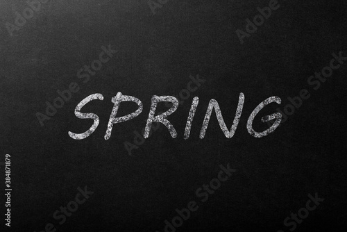 inscription "spring" written in white chalk on a black chalkboard.