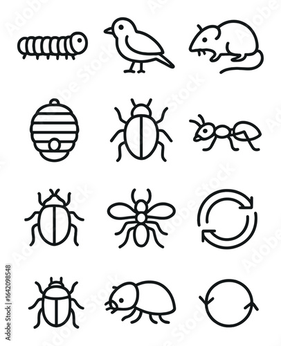 Insect Food Chain Icons. Outline icon set of insect-based food chains: caterpillar, bird, spider, insectivore