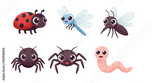 Insect set line. Ladybug, dragonfly, mosquito, spider and worm. Cute cartoon kawaii funny character. Flat design. White background. Isolated.