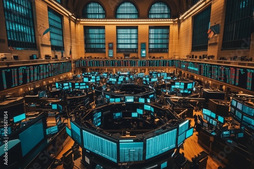 Inside a bustling stock exchange with traders active at work during a busy trading session in the late afternoon