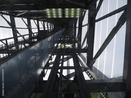Inside metal construction of ski jump elevator in Holmenkollen near european capital city of Oslo in Norway