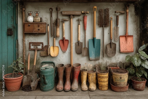 Inside of potting shed showing gardening tools, watering can, boots, and straw hat hangin on wall