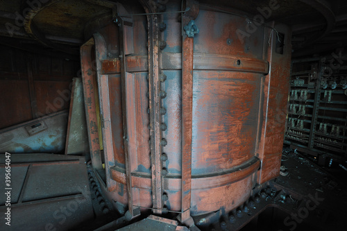 Inside rusty old dock crane in abandoned industrial cargo port of ghost town Pripyat