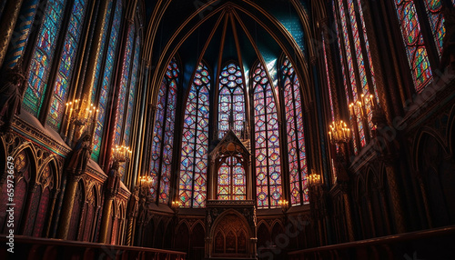 Inside the gothic cathedral, stained glass illuminates the majestic altar generated by AI