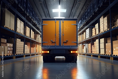 Inside the warehouse, a transportation truck is surrounded by boxes and shelves.