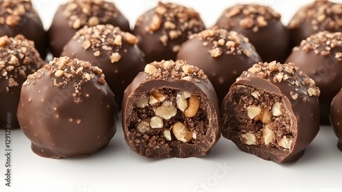 Inside view of chocolate truffles with crunchy nut filling. Chocolate-covered nut truffles with one cut in half, revealing crunchy filling of mixed nuts and chocolate ganache on white background