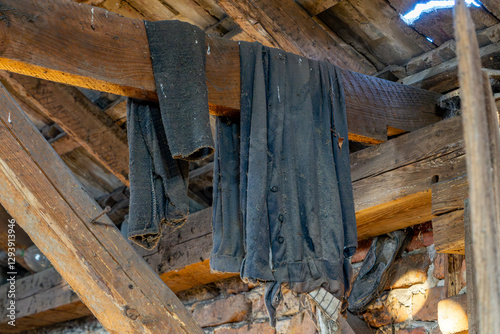 inside view of old falling apart barn. abandoned barn. old clothes hanging on wooden beam in barn