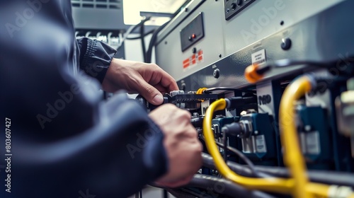 Inspecting backup generators for data centers, close-up, detailed maintenance checks