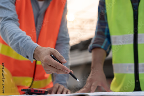 inspector or engineer is inspecting construction and quality assurance new house using a blue print. Engineer or architects or contactor work to build the house before handing it over to the homeowner