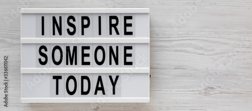 'Inspire someone today' words on a modern board on a white wooden background, top view. Overhead, from above, flat lay. Space for text.