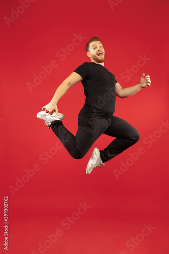 Inspired. Full length portrait of young successfull high jumping man gesturing isolated on red studio background. Attractive male caucasian model. Copyspace. Human emotions, facial expression concept.