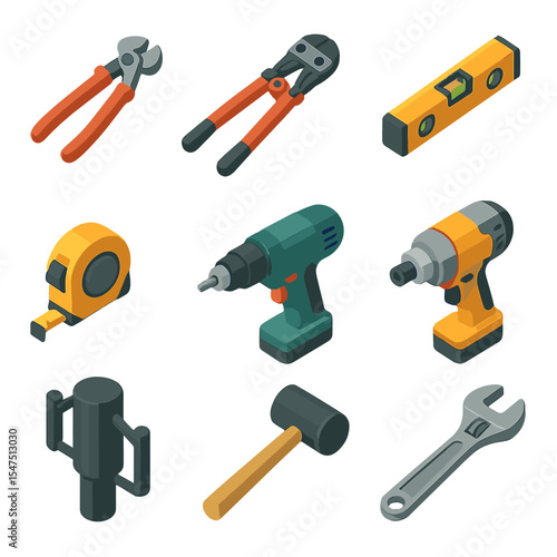 Installation Tools Icon Set. Isometric Flat icon set of installation tools and equipment: fence pliers, bolt cutter, level, tape