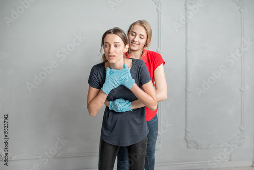 Instructor showing how to safe a life when the human is choked standing during the fisr aid training indoors