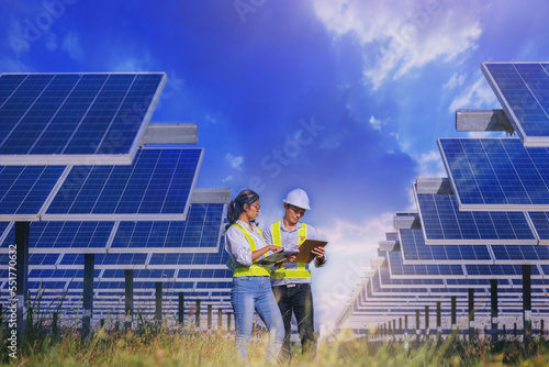 instrument technician survey, checking, maintenance electric system at solar panel field in cloudy sky.