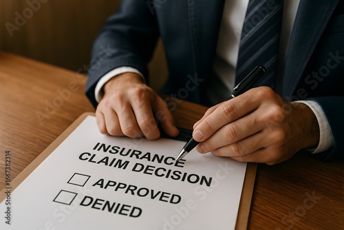 Insurance claim decision form signed by professional. Concept of risk management and financial security.