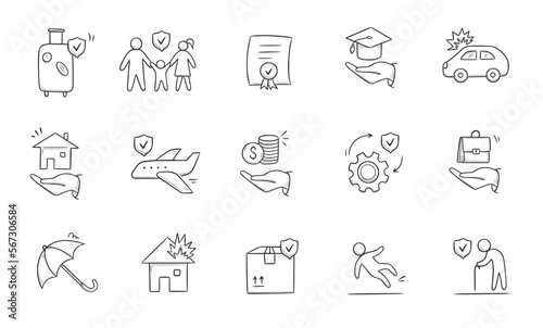 Insurance doodle icon set. Hand drawn sketch life shield, insurance umbrella, medical safety icon set. Health safety, car accident, house protect vector illustration.