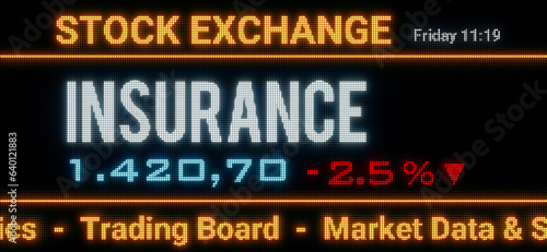Insurance index. Stock market data, insurance stocks price information and percentage changes on a screen. Stock exchange, business, sector index and trading concept. 3D illustration