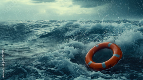 insurance, rescue and protection concept. lifebuoy in the waves of a stormy sea