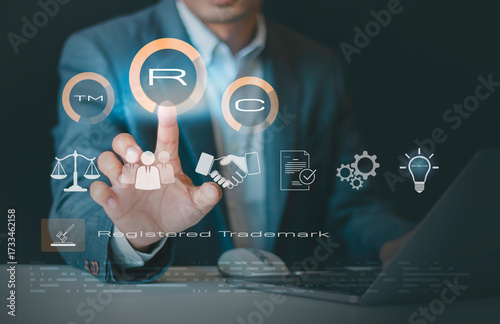 Intellectual property law concept with registered trademark, patent, and copyright symbols, representing brand protection, author rights, trademark license, and commercial business security.