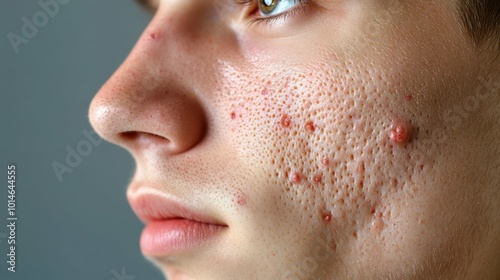 Intense Acne Vulgaris: Detailed Close-Up of Red Bumps and Scars on Human Face