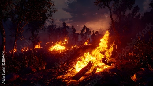 Intense and dramatic scene of a raging wildfire blazing through a forested landscape under a darkening sky at dusk The flames are roaring and spreading rapidly