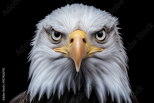 Intense close-up portrait of a bald eagle, highlighting wildlife protection, sharp focus on the piercing eyes, detailed feathers, powerful beak, black background, selective focus